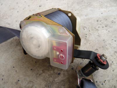 写真はリトラクター:ELR(Emergency-Locking Retrakutor)というパーツです。ブレーキをかけたり、衝突したときは、写真の黄色い爪が傾いて、白い歯車に引っかかるようになっています。
